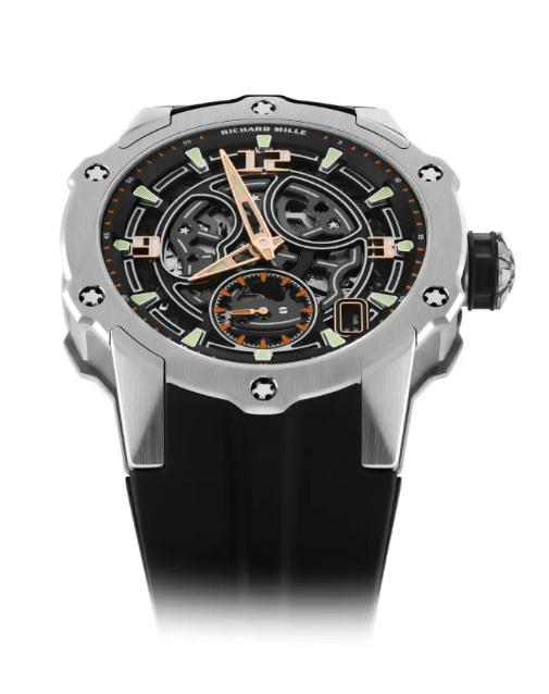 Design: The RM 033's design considers the movement, case, and dial as a unified whole, ensuring harmony. The caseback eliminates the need for a case ring, and the movement rests on a chassis-mounting rubber secured with grade 5 titanium screws. Its curved caseback, a hallmark of the entire Richard Mille collection, showcases elegant ergonomics.